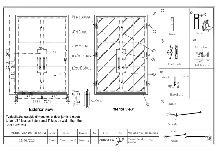 Low Profile 6 Grid Double Size: 72x108Finish: BlackGlass: Clear Low-E Swing: LeftPrice:$6,480Sku: #1B24